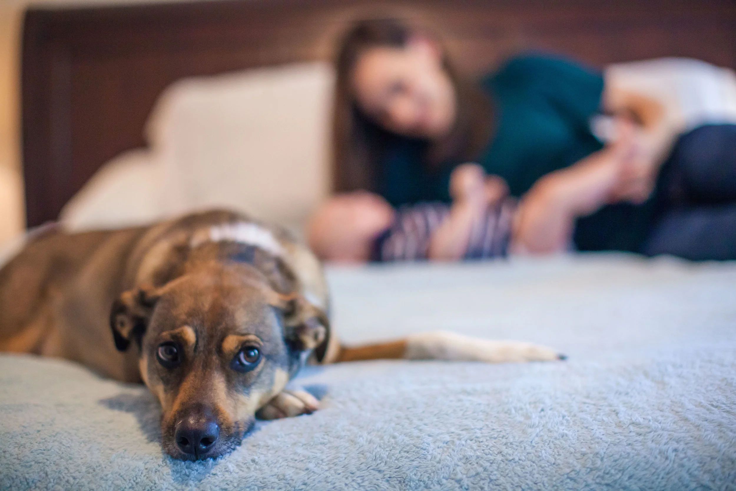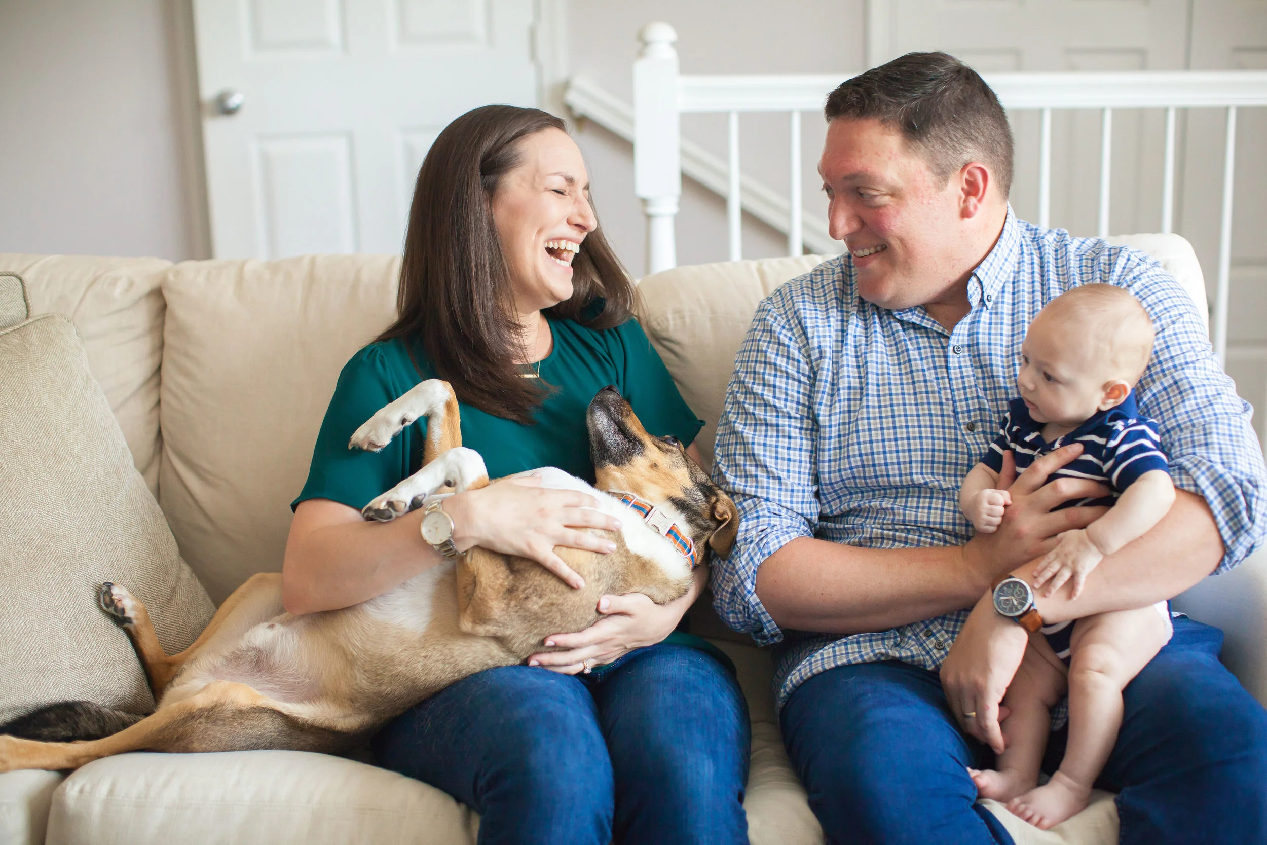 Attempting to get their dog to lay with dignity in Sharon’s lap, we burst
